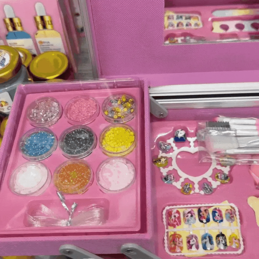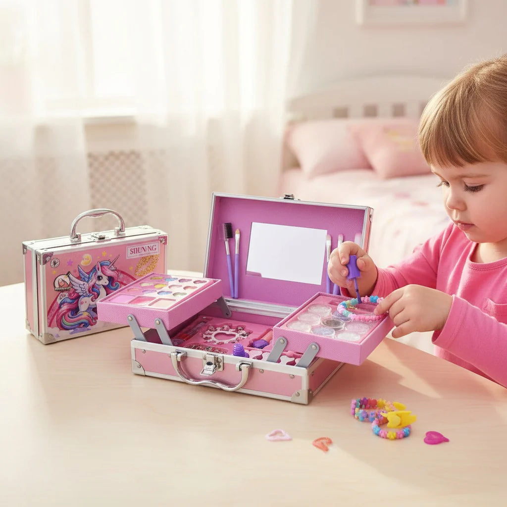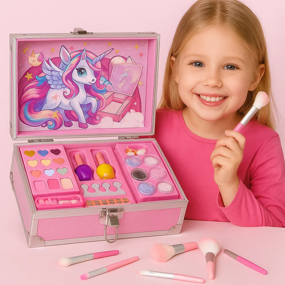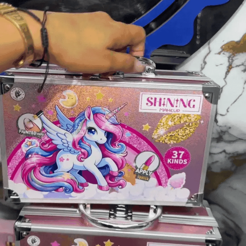 Este hermoso kit de maquillaje viene dentro de una maleta rígida metálica, con un diseño de unicornio brillante que enamora desde el primer instante.